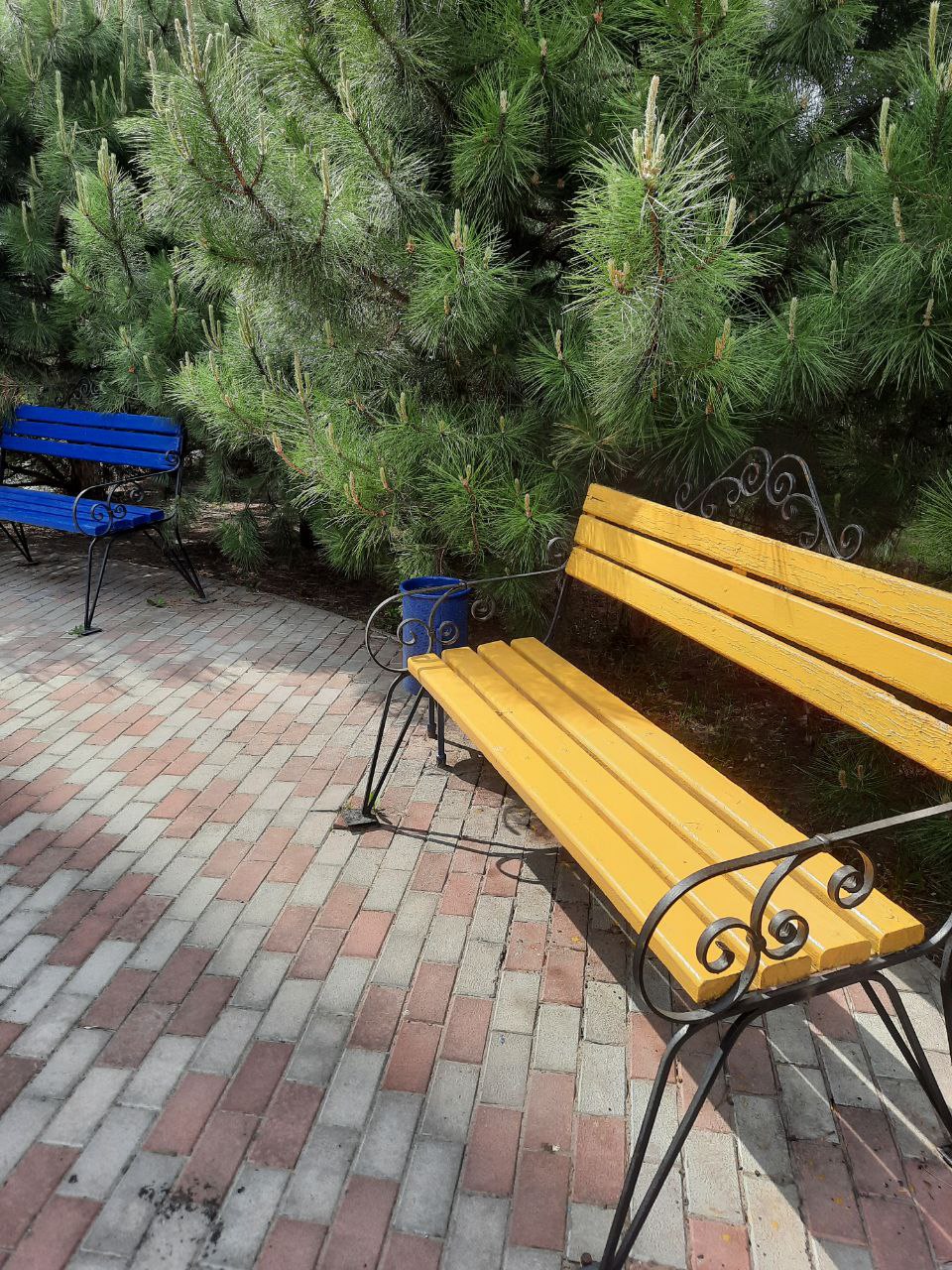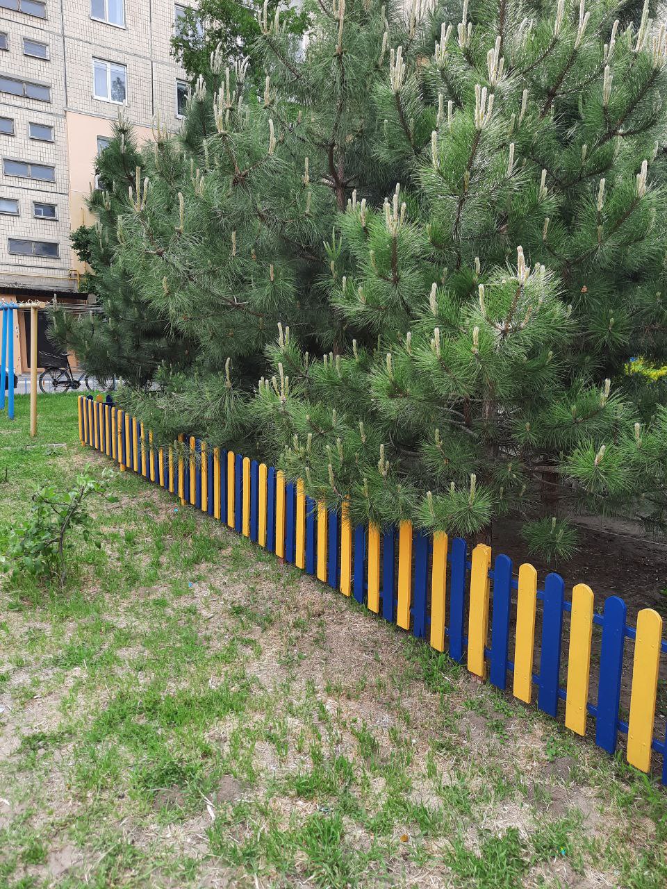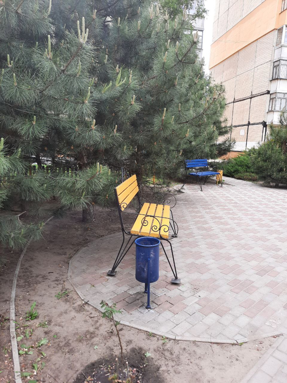 У Новомосковську з’явився невеликий сквер поблизу будинків, де мешкають з півсотні переселенців. Там проклали доріжки, посадили дерева – листяні та ялинки. А також встановили лавочки, урни, облаштували клумби, висадили квіти, пофарбували паркани – у патріотичні синьо-жовті кольори.