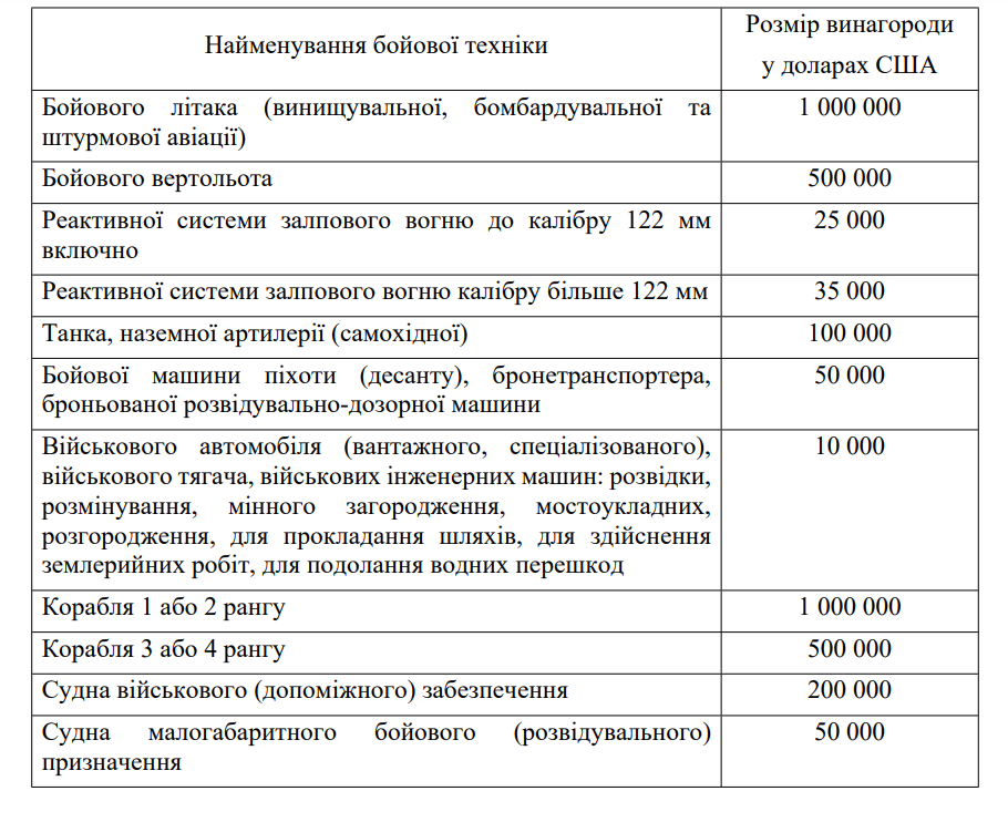 За добровільно передану ЗСУ придатну для застосування бойову техніку агресора передбачені наступні грошові нагороди: