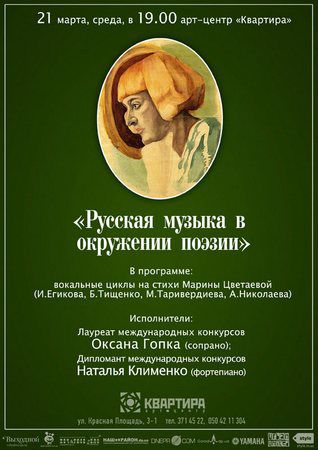 В этот вечер вашему вниманию будут представлены вокальные циклы на стихи Марины Цветаевой (И.Егикова, Б.Тищенко, М.Таривердиева, А.Николаева).