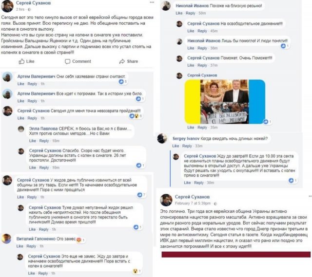 Нагадаємо, 9 лютого 2018 року Сергій Суханов виклав на своїй сторінці в Фейсбуці повідомлення із закликом влаштувати в Дніпрі єврейські погроми (орфографія і пунктуація збережені)