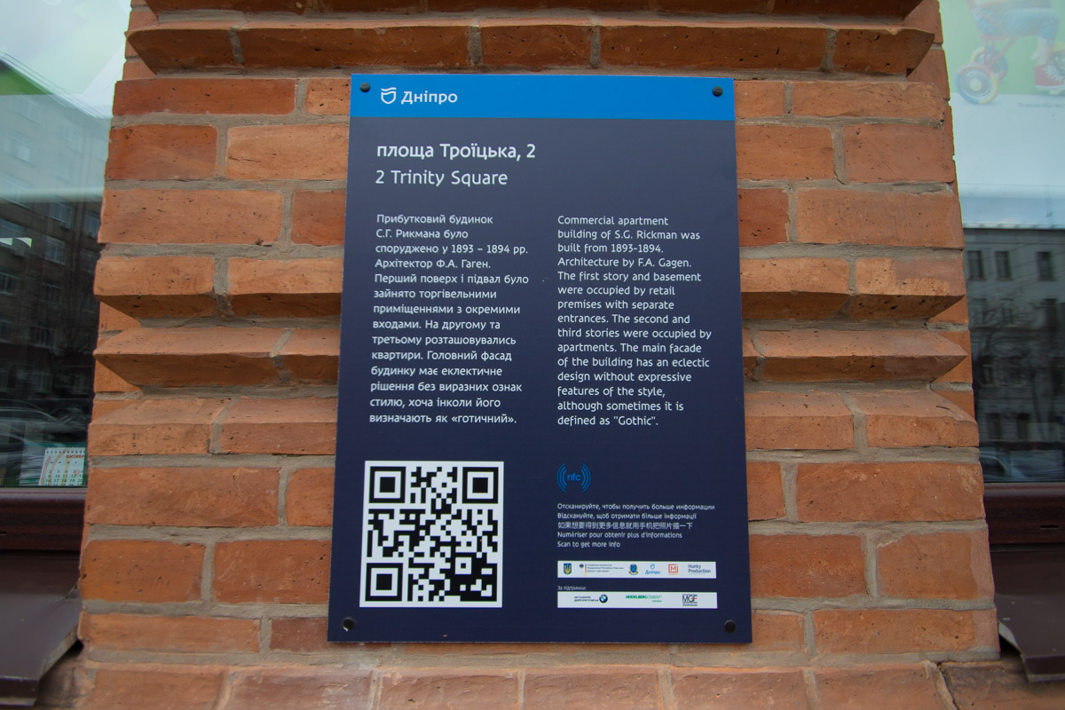 В честь Недели Германии в Украине-2017 в Днепре открыли новый туристический маршрут, объединяющий в себе здания, спроектированные немецкими архитекторами. Данный маршрут включает 16 зданий. Таблички с QR-кодами можно найти на зданиях по таким адресам: площадь Троицкая, 2, улица Грушевского, 4, улица Староказацкая, 57, проспект Яворницкого, 36, 102, 103, улица Вернадского, 27, улица Глинки, 16, улица Воскресенская, 3, 8, 20, улица Фабра, 7, 16, проспект Поля, 11, улица Юрия Савченко, 2 и улица Княгини Ольги, 2. Особенность QR-табличек в том, что любой желающий может пройтись по маршруту без гида и через приложение самостоятельно узнать более подробную историю памятников архитектуры. Кроме того, данный формат будет удобен для гостей города, так как через QR-код доступна информация сразу на нескольких языках.