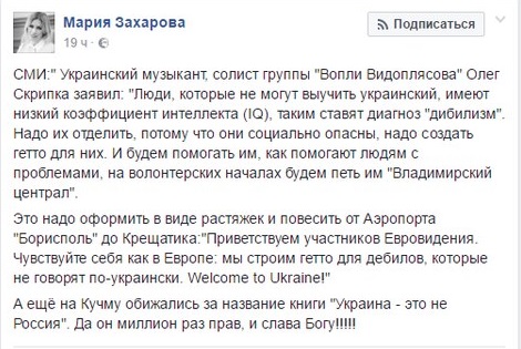 Люди, які не можуть вивчити українську, мають низький IQ, таким ставлять діагноз дебілізм. Треба їх відокремити, тому що вони соціально небезпечні, треба створити гетто для них. І будемо допомагати їм, як допомагають людям з вадами, на волонтерських засадах будемо співати їм Володимирський централ.